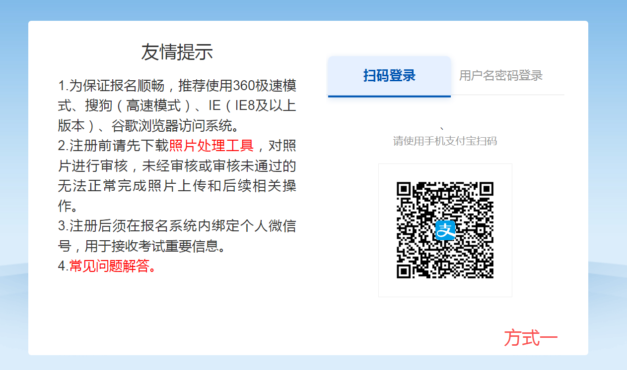 1.使用支付宝“扫码登录”并注册时,务必按报名系统提示完善用户名、密码等注册信息。注册成功后,也可直接使用设置的用户名密码登录报名系统。