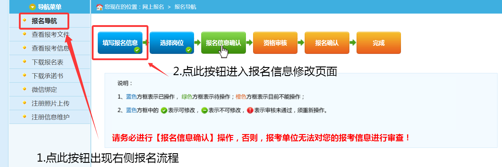 1.未进行“报名信息确认”操作的,先点击导航菜单页面中的“报名导航”按钮,再点击报考导航页面中的“填写报名信息”按钮进行修改。