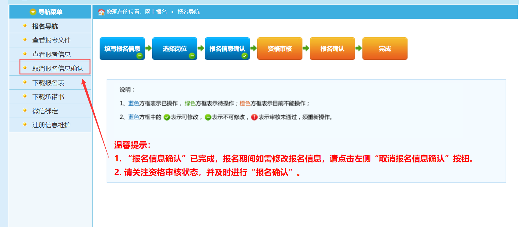 2.已进行“报名信息确认”操作的,须先取消报名信息确认状态,再按照“未进行‘报名信息确认’操作”进行修改。具体操作:点击导航菜单页面中的“取消报名信息确认”按钮。